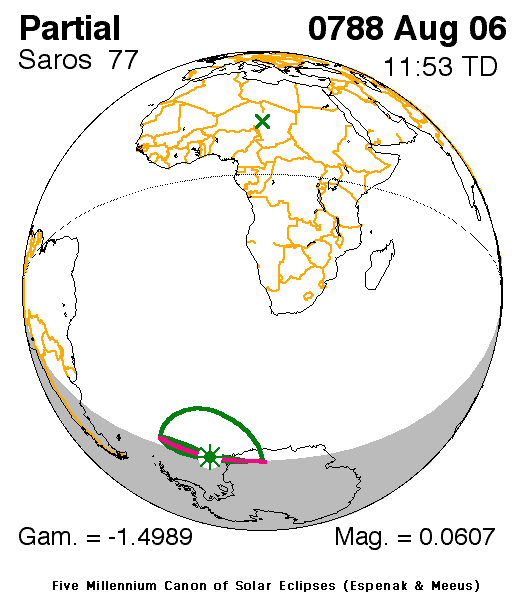 A partial eclipse of the Sun occurred on 6 August, 0788 UT Old Style, with maximum eclipse at 11:02 UT. With only 6% of the Sun covered at maximum eclipse, this was a very marginal eclipse at best, and rather uninteresting.