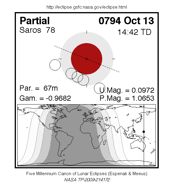 A partial eclipse of the Moon occurred on 13 October, 0794 UT Old Style, with maximum eclipse at 13:52 UT. A tiny bite out of the Moon may have been visible at maximum, though just 10% of the Moon was shadowed in a partial eclipse which lasted for 1 hour and 7 minutes. A shading across the moon from the Earth's penumbral shadow should have been visible at maximum eclipse.