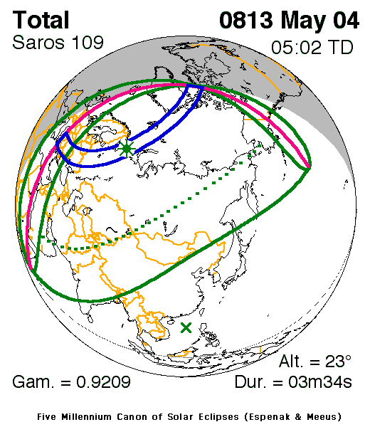 A total eclipse of the Sun occurred on 4 May, 0813 UT Old Style, with maximum eclipse at 04:14 UT. A dramatic total eclipse plunged the Sun into darkness for 3 minutes and 34 seconds at maximum, creating an amazing spectacle for observers in a very broad path, 556 km wide at maximum.