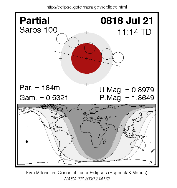 A partial eclipse of the Moon occurred on 21 July, 0818 UT Old Style, with maximum eclipse at 10:27 UT. The Moon was strikingly shadowed in this deep partial eclipse which lasted 3 hours and 4 minutes, with 90% of the Moon in darkness at maximum.