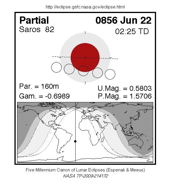 A partial eclipse of the Moon occurred on 22 June, 0856 UT Old Style, with maximum eclipse at 01:43 UT. The Earth's shadow on the moon was clearly visible in this eclipse, with 58% of the Moon in shadow; the partial eclipse lasted for 2 hours and 40 minutes.