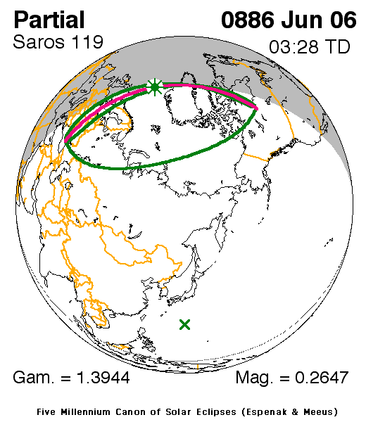 A partial eclipse of the Sun occurred on 6 June, 0886 UT Old Style, with maximum eclipse at 02:50 UT. A small partial eclipse barely darkened the Sun. With just 26% of the Sun covered for viewers closest to the center, this was of limited interest.