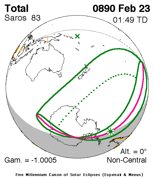 A total eclipse of the Sun occurred on 23 February, 0890 UT Old Style, with maximum eclipse at 01:11 UT. A fleeting total eclipse covered only an extremely narrow strip and lasted for just moments at the point of maximum eclipse.