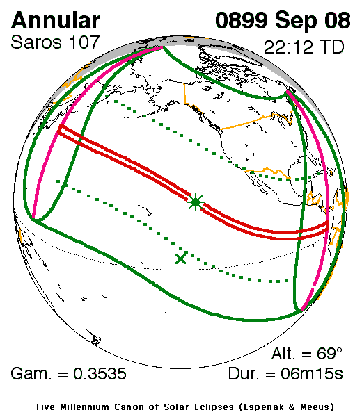 An annular eclipse of the Sun occurred on 8 September, 0899 UT Old Style, with maximum eclipse at 21:35 UT. The Sun was 95% covered in a moderate annular eclipse, lasting 6 minutes and 15 seconds and covering a broad path up to 210 km wide.