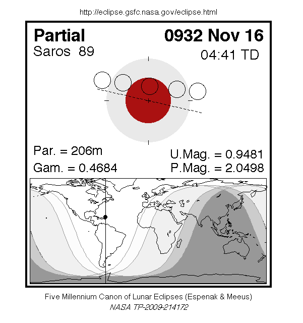 A partial eclipse of the Moon occurred on 16 November, 0932 UT Old Style, with maximum eclipse at 04:08 UT. The Moon was almost covered by the Earth's shadow in a very deep partial eclipse, which lasted 3 hours and 27 minutes. With 95% of the Moon in shadow at maximum eclipse, this was quite a memorable event.