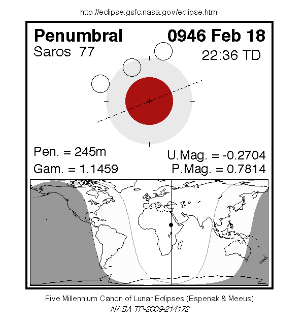 A penumbral eclipse of the Moon occurred on 18 February, 0946 UT Old Style, with maximum eclipse at 22:04 UT. This subtle penumbral eclipse may have been visible to a skilled observer at maximum eclipse. 78% of the Moon's disc was partially shaded by the Earth (none of it was in total shadow), which caused a gentle shadow gradient across its disc at maximum; the eclipse as a whole lasted 4 hours and 5 minutes.