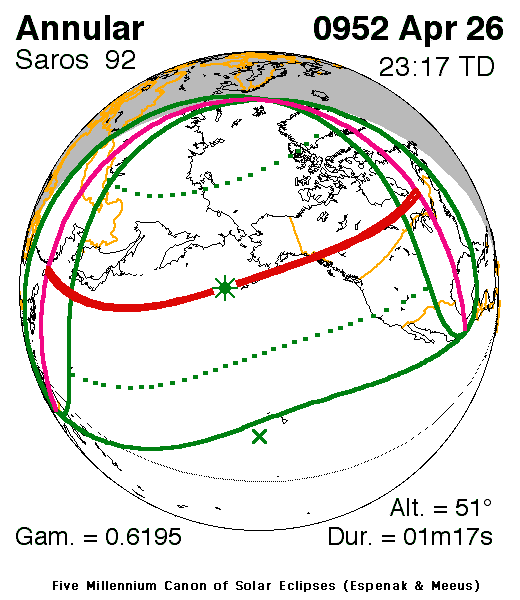 An annular eclipse of the Sun occurred on 26 April, 0952 UT Old Style, with maximum eclipse at 22:46 UT. A large annular eclipse covered 99% of the Sun, creating a dramatic spectacle for observers in a narrow path at most 67 km wide; it lasted 1 minute and 17 seconds at the point of maximum eclipse.