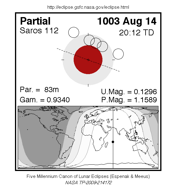 A partial eclipse of the Moon occurred on 14 August, 1003 UT Old Style, with maximum eclipse at 19:46 UT. At maximum eclipse, a small bite out of the Moon should have been visible. The eclipse lasted for 1 hour and 23 minutes, with just 13% of the Moon in shadow at maximum.