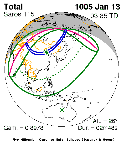 A total eclipse of the Sun occurred on 13 January, 1005 UT Old Style, with maximum eclipse at 03:09 UT. A dramatic total eclipse plunged the Sun into darkness for 2 minutes and 48 seconds at maximum, creating an amazing spectacle for observers in a very broad path, 267 km wide at maximum.