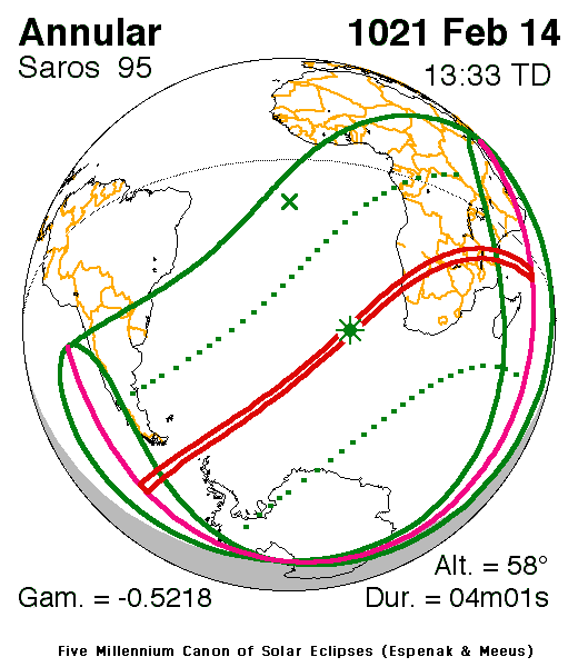 An annular eclipse of the Sun occurred on 14 February, 1021 UT Old Style, with maximum eclipse at 13:09 UT. The Sun was 96% covered in a moderate annular eclipse, lasting 4 minutes and 1 second and covering a broad path up to 182 km wide.
