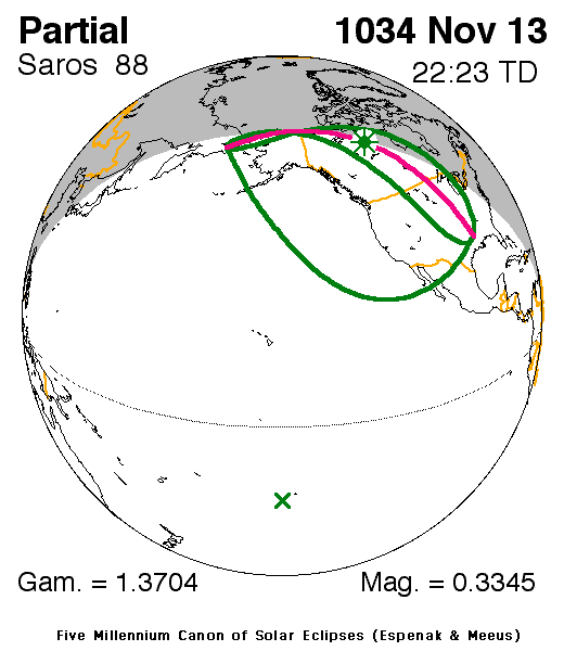 A partial eclipse of the Sun occurred on 13 November, 1034 UT Old Style, with maximum eclipse at 22:00 UT. A small partial eclipse barely darkened the Sun. With just 33% of the Sun covered for viewers closest to the center, this was of limited interest.