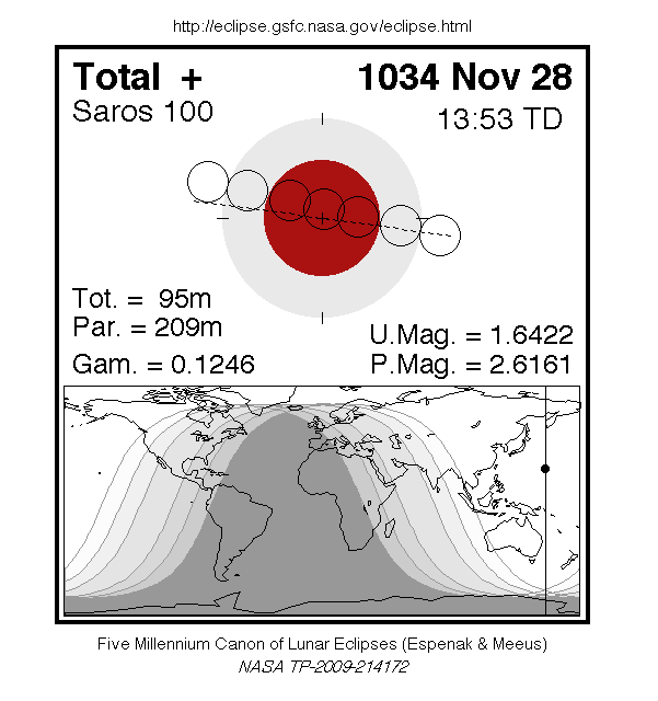 A total eclipse of the Moon occurred on 28 November, 1034 UT Old Style, with maximum eclipse at 13:29 UT. A dramatic total eclipse lasting 1 hour and 35 minutes plunged the full Moon into deep darkness, as it passed right through the centre of the Earth's umbral shadow. While the visual effect of a total eclipse is variable, the Moon may have been stained a deep orange or red colour at maximum eclipse. This was a great spectacle for everyone who saw it. The partial eclipse lasted for 3 hours and 29 minutes in total.