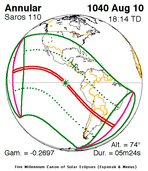 An annular eclipse of the Sun occurred on 10 August, 1040 UT Old Style, with maximum eclipse at 17:51 UT. The Sun was 95% covered in a moderate annular eclipse, lasting 5 minutes and 24 seconds and covering a broad path up to 174 km wide.