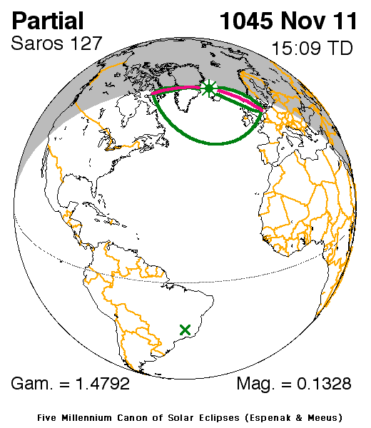 A partial eclipse of the Sun occurred on 11 November, 1045 UT Old Style, with maximum eclipse at 14:47 UT. With only 13% of the Sun covered at maximum eclipse, this was a very marginal eclipse at best, and rather uninteresting.