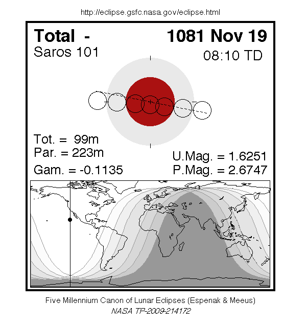 A total eclipse of the Moon occurred on 19 November, 1081 UT Old Style, with maximum eclipse at 07:50 UT. A dramatic total eclipse lasting 1 hour and 39 minutes plunged the full Moon into deep darkness, as it passed right through the centre of the Earth's umbral shadow. While the visual effect of a total eclipse is variable, the Moon may have been stained a deep orange or red colour at maximum eclipse. This was a great spectacle for everyone who saw it. The partial eclipse lasted for 3 hours and 44 minutes in total.