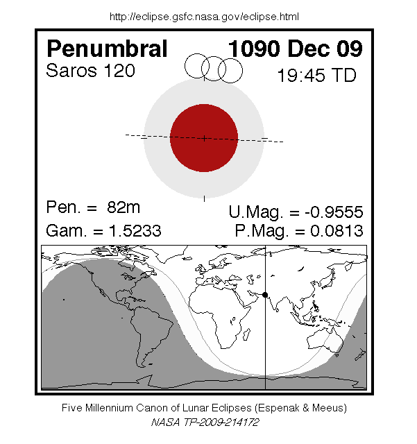 A penumbral eclipse of the Moon occurred on 9 December, 1090 UT Old Style, with maximum eclipse at 19:26 UT. In this extremely marginal eclipse, the Moon barely clipped the edge of the Earth's penumbral shadow. This caused a microscopic darkening of just 8% of the Moon's disc for 1 hour and 22 minutes, which was essentially impossible to see.