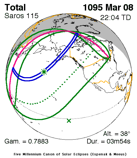 A total eclipse of the Sun occurred on 8 March, 1095 UT Old Style, with maximum eclipse at 21:45 UT. A dramatic total eclipse plunged the Sun into darkness for 3 minutes and 54 seconds at maximum, creating an amazing spectacle for observers in a very broad path, 291 km wide at maximum.