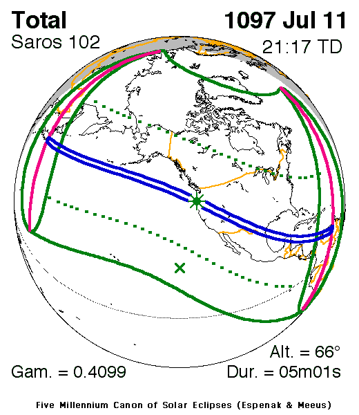 A total eclipse of the Sun occurred on 11 July, 1097 UT Old Style, with maximum eclipse at 20:59 UT. A dramatic total eclipse plunged the Sun into darkness for 5 minutes and 1 second at maximum, creating an amazing spectacle for observers in a broad path up to 239 km wide.