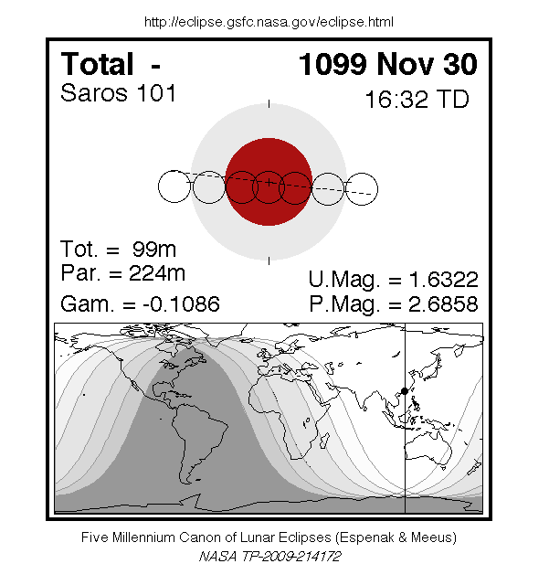 A total eclipse of the Moon occurred on 30 November, 1099 UT Old Style, with maximum eclipse at 16:14 UT. A dramatic total eclipse lasting 1 hour and 39 minutes plunged the full Moon into deep darkness, as it passed right through the centre of the Earth's umbral shadow. While the visual effect of a total eclipse is variable, the Moon may have been stained a deep orange or red colour at maximum eclipse. This was a great spectacle for everyone who saw it. The partial eclipse lasted for 3 hours and 44 minutes in total.