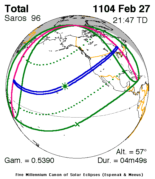 A total eclipse of the Sun occurred on 27 February, 1104 UT Old Style, with maximum eclipse at 21:29 UT. A dramatic total eclipse plunged the Sun into darkness for 4 minutes and 49 seconds at maximum, creating an amazing spectacle for observers in a broad path up to 221 km wide.