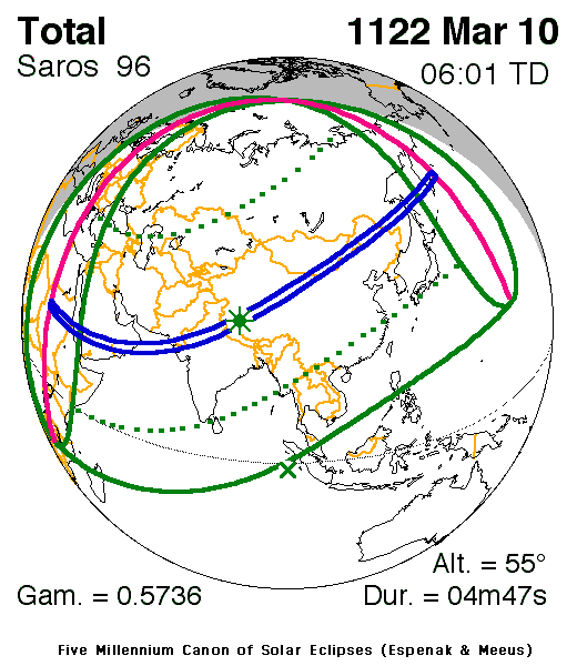 A total eclipse of the Sun occurred on 10 March, 1122 UT Old Style, with maximum eclipse at 05:44 UT. A dramatic total eclipse plunged the Sun into darkness for 4 minutes and 47 seconds at maximum, creating an amazing spectacle for observers in a broad path up to 235 km wide.