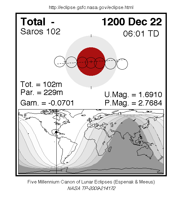 A total eclipse of the Moon occurred on 22 December, 1200 UT Old Style, with maximum eclipse at 05:48 UT. A dramatic total eclipse lasting 1 hour and 42 minutes plunged the full Moon into deep darkness, as it passed right through the centre of the Earth's umbral shadow. While the visual effect of a total eclipse is variable, the Moon may have been stained a deep orange or red colour at maximum eclipse. This was a great spectacle for everyone who saw it. The partial eclipse lasted for 3 hours and 49 minutes in total.