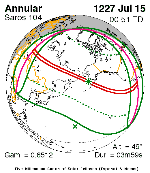 An annular eclipse of the Sun occurred on 15 July, 1227 UT Old Style, with maximum eclipse at 00:40 UT. The Sun was 95% covered in a moderate annular eclipse, lasting 3 minutes and 59 seconds and covering a broad path up to 222 km wide.