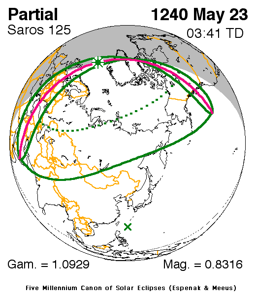 A partial eclipse of the Sun occurred on 23 May, 1240 UT Old Style, with maximum eclipse at 03:30 UT. This was a deep partial eclipse, with 83% of the Sun covered for viewers closest to the center. This provided a significant spectacle for those who saw it.