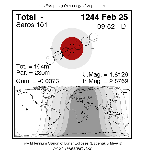 A total eclipse of the Moon occurred on 25 February, 1244 UT Old Style, with maximum eclipse at 09:41 UT. A dramatic total eclipse lasting 1 hour and 44 minutes plunged the full Moon into deep darkness, as it passed right through the centre of the Earth's umbral shadow. While the visual effect of a total eclipse is variable, the Moon may have been stained a deep orange or red colour at maximum eclipse. This was a great spectacle for everyone who saw it. The partial eclipse lasted for 3 hours and 50 minutes in total.