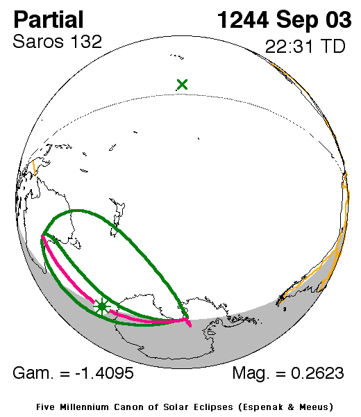 A partial eclipse of the Sun occurred on 3 September, 1244 UT Old Style, with maximum eclipse at 22:21 UT. A small partial eclipse barely darkened the Sun. With just 26% of the Sun covered for viewers closest to the center, this was of limited interest.