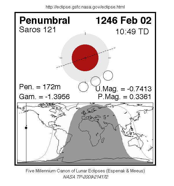 A penumbral eclipse of the Moon occurred on 2 February, 1246 UT Old Style, with maximum eclipse at 10:38 UT. This very subtle penumbral eclipse was essentially invisible to the naked eye; though it lasted 2 hours and 52 minutes, just 34% of the Moon's disc was in partial shadow (with no part of it in complete shadow).