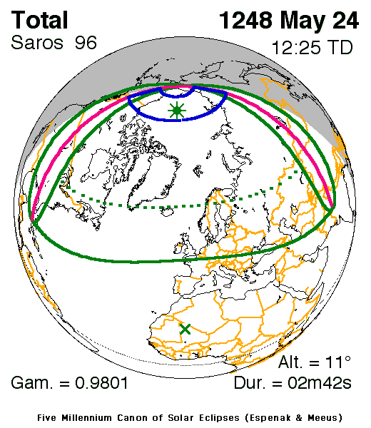A total eclipse of the Sun occurred on 24 May, 1248 UT Old Style, with maximum eclipse at 12:14 UT. A dramatic total eclipse plunged the Sun into darkness for 2 minutes and 42 seconds at maximum, creating an amazing spectacle for observers in a very broad path, 997 km wide at maximum.