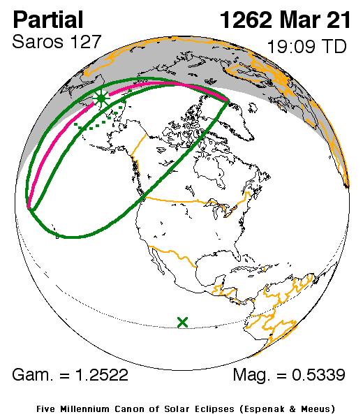 A partial eclipse of the Sun occurred on 21 March, 1262 UT Old Style, with maximum eclipse at 18:59 UT. A moderate partial eclipse, with 53% of the Sun covered for viewers closest to the center, created an interesting spectacle.