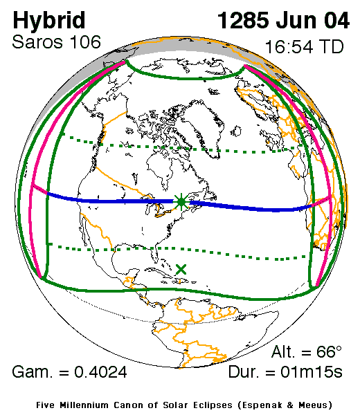 A hybrid eclipse of the Sun occurred on 4 June, 1285 UT Old Style, with maximum eclipse at 16:45 UT. The Sun was darkened for 1 minute and 15 seconds by a dramatic hybrid eclipse covering a narrow path at most 54 km wide. This was a sight worth seeing.