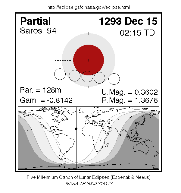 A partial eclipse of the Moon occurred on 15 December, 1293 UT Old Style, with maximum eclipse at 02:06 UT. The Earth's shadow on the moon was clearly visible in this eclipse, with 36% of the Moon in shadow; the partial eclipse lasted for 2 hours and 9 minutes.