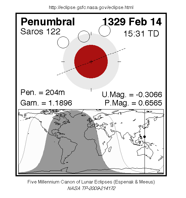 A penumbral eclipse of the Moon occurred on 14 February, 1329 UT Old Style, with maximum eclipse at 15:23 UT. This subtle penumbral eclipse may have been visible to a skilled observer at maximum eclipse. 66% of the Moon's disc was partially shaded by the Earth (none of it was in total shadow), which caused a gentle shadow gradient across its disc at maximum; the eclipse as a whole lasted 3 hours and 24 minutes.
