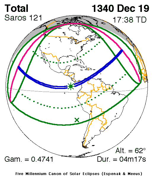 A total eclipse of the Sun occurred on 19 December, 1340 UT Old Style, with maximum eclipse at 17:31 UT. A dramatic total eclipse plunged the Sun into darkness for 4 minutes and 17 seconds at maximum, creating an amazing spectacle for observers in a broad path up to 168 km wide.