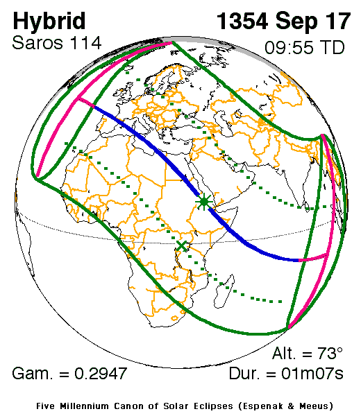 A hybrid eclipse of the Sun occurred on 17 September, 1354 UT Old Style, with maximum eclipse at 09:48 UT. The Sun was darkened for 1 minute and 7 seconds by a dramatic hybrid eclipse covering a narrow path at most 44 km wide. This was a sight worth seeing.