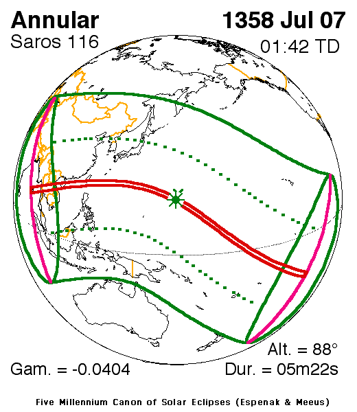 An annular eclipse of the Sun occurred on 7 July, 1358 UT Old Style, with maximum eclipse at 01:35 UT. The Sun was 96% covered in a moderate annular eclipse, lasting 5 minutes and 22 seconds and covering a broad path up to 160 km wide.