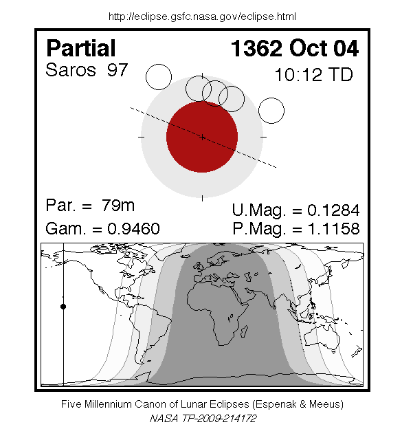 A partial eclipse of the Moon occurred on 4 October, 1362 UT Old Style, with maximum eclipse at 10:05 UT. At maximum eclipse, a small bite out of the Moon should have been visible. The eclipse lasted for 1 hour and 19 minutes, with just 13% of the Moon in shadow at maximum.
