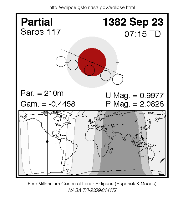 A partial eclipse of the Moon occurred on 23 September, 1382 UT Old Style, with maximum eclipse at 07:09 UT. The Moon was almost covered by the Earth's shadow in a very deep partial eclipse, which lasted 3 hours and 30 minutes. With 100% of the Moon in shadow at maximum eclipse, this was quite a memorable event.