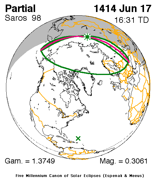 A partial eclipse of the Sun occurred on 17 June, 1414 UT Old Style, with maximum eclipse at 16:25 UT. A small partial eclipse barely darkened the Sun. With just 31% of the Sun covered for viewers closest to the center, this was of limited interest.