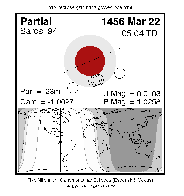 A partial eclipse of the Moon occurred on 22 March, 1456 UT Old Style, with maximum eclipse at 04:59 UT. A tiny bite out of the Moon may have been visible at maximum, though just 1% of the Moon was shadowed in a partial eclipse which lasted for 23 minutes and 30 seconds. A shading across the moon from the Earth's penumbral shadow should have been visible at maximum eclipse.