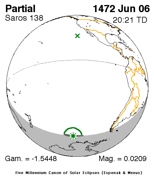 A partial eclipse of the Sun occurred on 6 June, 1472 UT Old Style, with maximum eclipse at 20:16 UT. With only 2% of the Sun covered at maximum eclipse, this was a very marginal eclipse at best, and rather uninteresting.