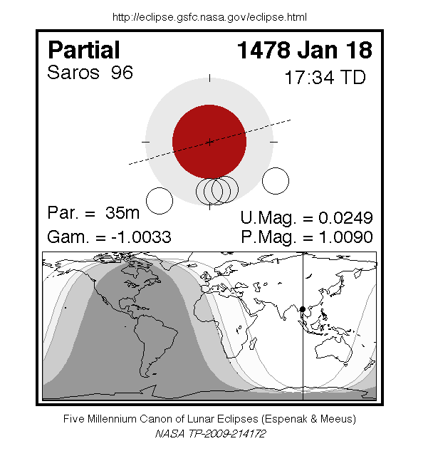 A partial eclipse of the Moon occurred on 18 January, 1478 UT Old Style, with maximum eclipse at 17:29 UT. A tiny bite out of the Moon may have been visible at maximum, though just 2% of the Moon was shadowed in a partial eclipse which lasted for 34 minutes and 42 seconds. A shading across the moon from the Earth's penumbral shadow should have been visible at maximum eclipse.