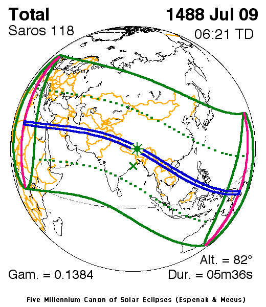 A total eclipse of the Sun occurred on 9 July, 1488 UT Old Style, with maximum eclipse at 06:17 UT. A dramatic total eclipse plunged the Sun into darkness for 5 minutes and 36 seconds at maximum, creating an amazing spectacle for observers in a broad path up to 219 km wide.