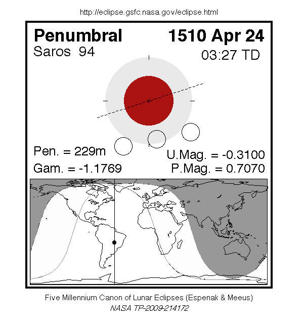 A penumbral eclipse of the Moon occurred on 24 April, 1510 UT Old Style, with maximum eclipse at 03:24 UT. This subtle penumbral eclipse may have been visible to a skilled observer at maximum eclipse. 71% of the Moon's disc was partially shaded by the Earth (none of it was in total shadow), which caused a gentle shadow gradient across its disc at maximum; the eclipse as a whole lasted 3 hours and 49 minutes.