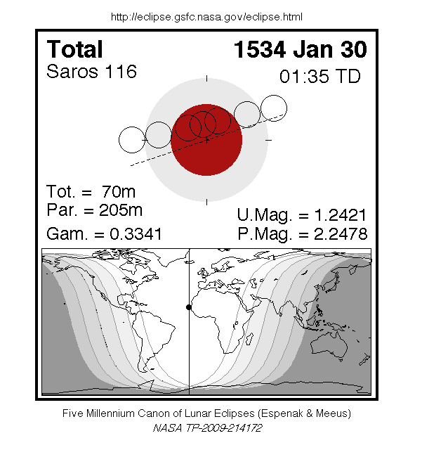 A total eclipse of the Moon occurred on 30 January, 1534 UT Old Style, with maximum eclipse at 01:31 UT. The Moon was plunged into darkness for 1 hour and 10 minutes, in a deep total eclipse which saw the Moon 24% of its diameter inside the Earth's umbral shadow. The visual effect of this depends on the state of the Earth's atmosphere, but the Moon may have been stained a deep red colour. The partial eclipse lasted for 3 hours and 25 minutes in total.