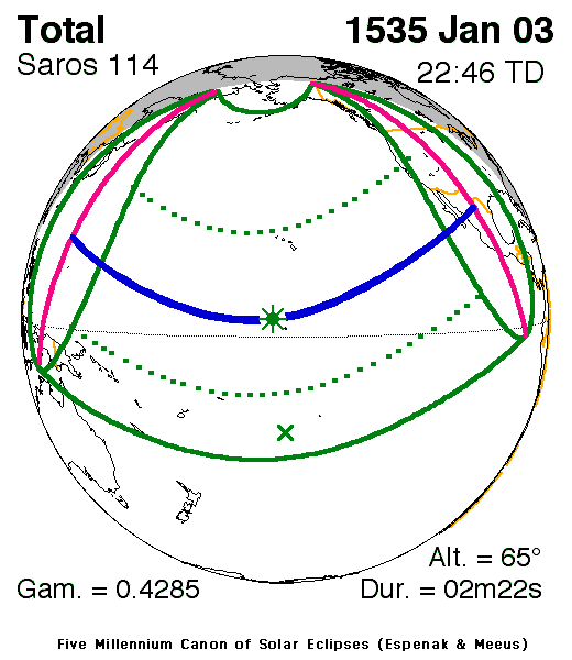 A total eclipse of the Sun occurred on 3 January, 1535 UT Old Style, with maximum eclipse at 22:43 UT. A dramatic total eclipse plunged the Sun into darkness for 2 minutes and 22 seconds at maximum, creating an amazing spectacle for observers in a path up to 86 km wide.