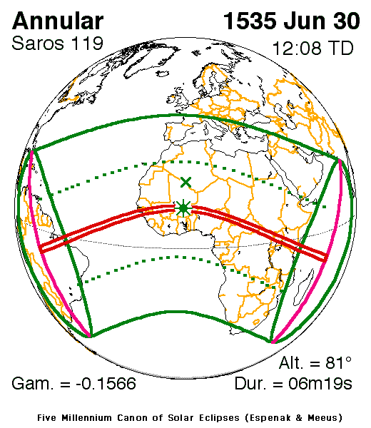 An annular eclipse of the Sun occurred on 30 June, 1535 UT Old Style, with maximum eclipse at 12:05 UT. The Sun was 95% covered in a moderate annular eclipse, lasting 6 minutes and 19 seconds and covering a broad path up to 173 km wide.